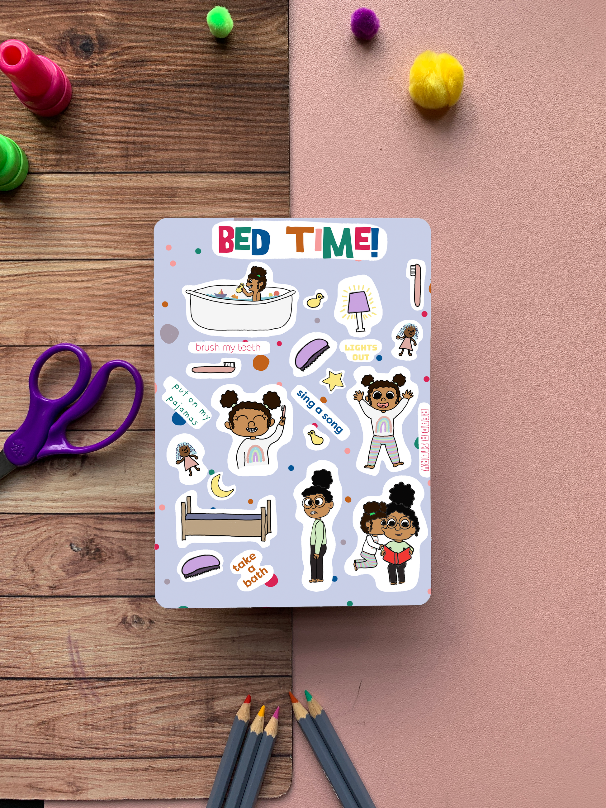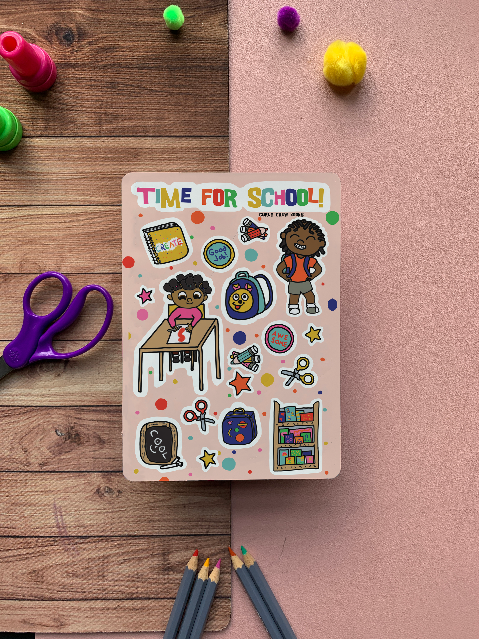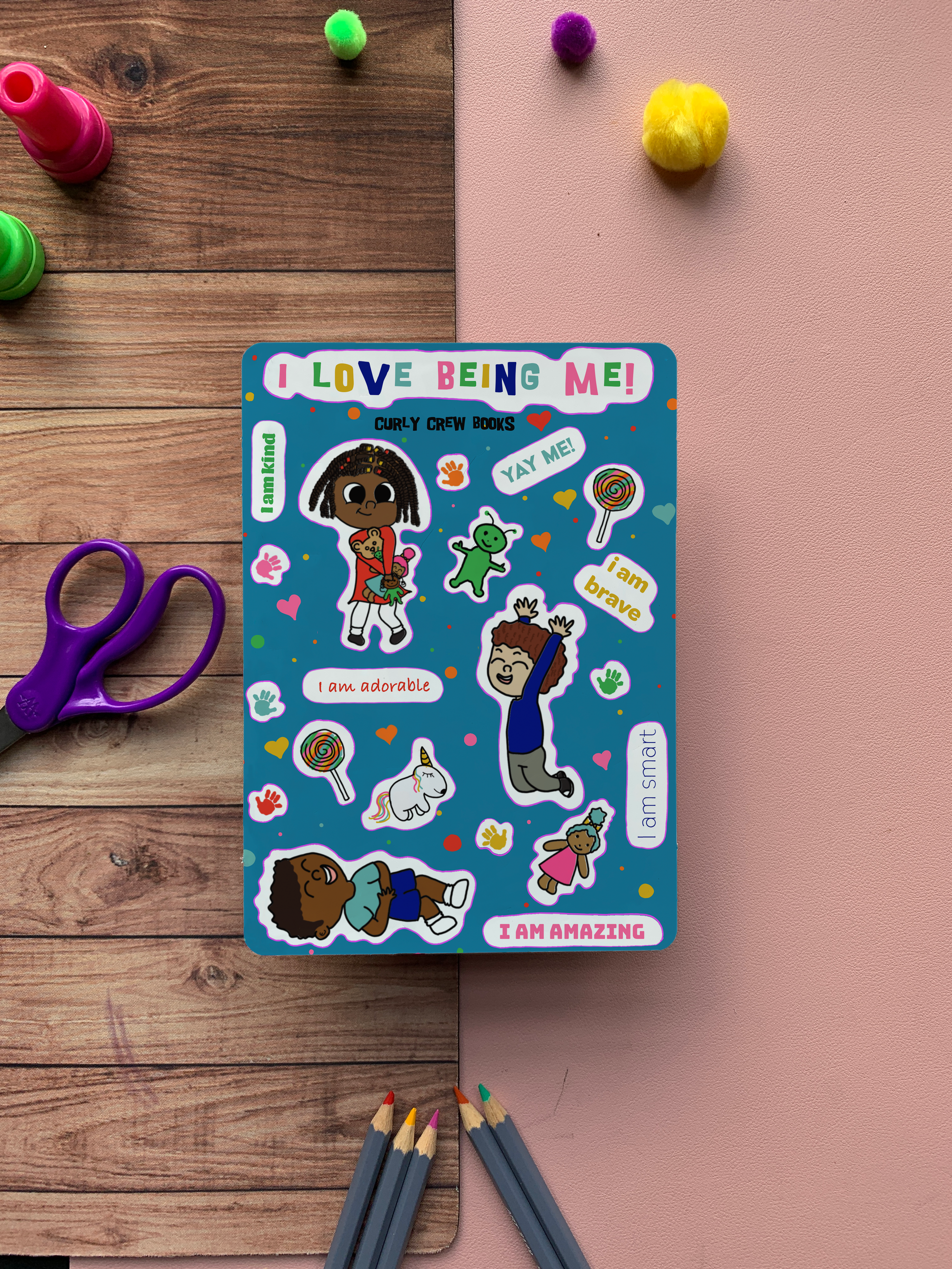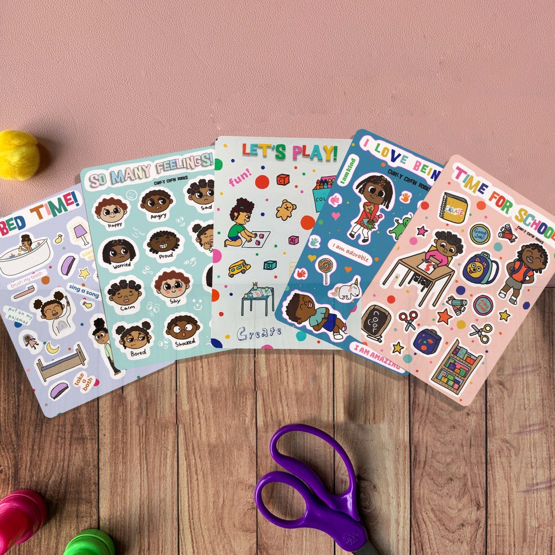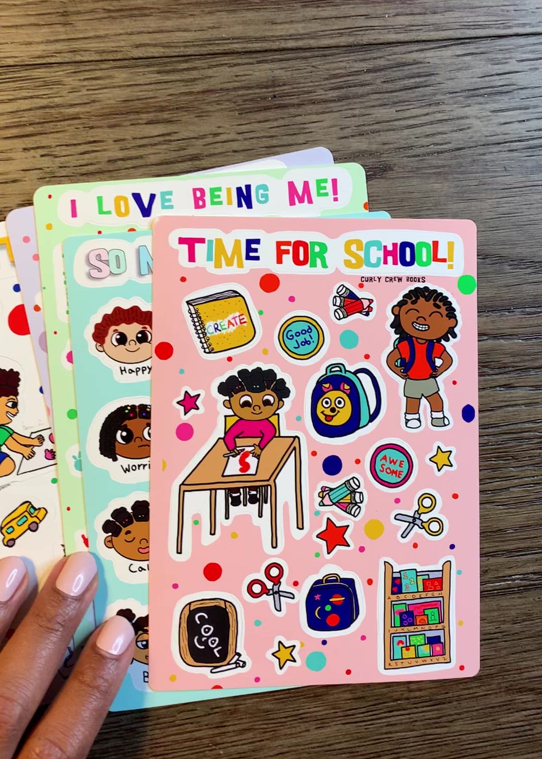 The Curly Crew “Sticker Fun” Pack comes with 5 stickers sheets, each with images and themes from one of our books. The pack includes:
